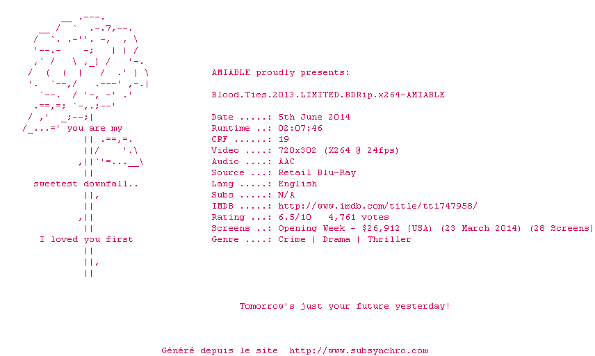 Telechargez le RSS « Fichier de la release Blood.Ties.2013.LIMITED.BDRip.x264-AMIABLE »
