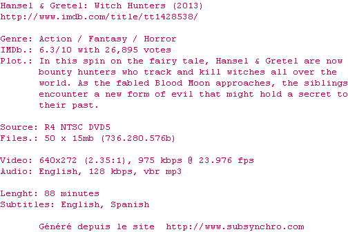 Y avez-vous pense ? Nous proposons déjà 17 sous-titres pour le film Hansel and Gretel: Witch Hunters. Avez-vous essaye de voir si ces sous-titres etaient compatibles avec cette release ? On vous laisse le soin de tester cela pour nous et de contribuer au site en postant le sous-titre en cas de compatiblite constatee !