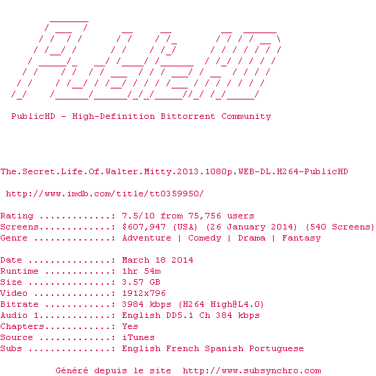 Telechargez le RSS « Fichier de la release The.Secret.Life.Of.Walter.Mitty.2013.1080p.WEB-DL.H264-PublicHD »