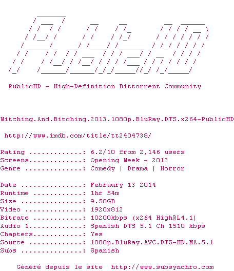 Telechargez le RSS « Fichier de la release Witching.And.Bitching.2013.1080p.BluRay.DTS.x264-PublicHD »