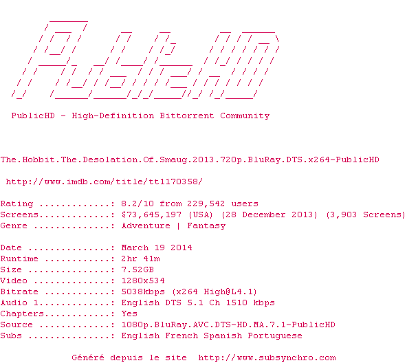 Telechargez le RSS « Fichier de la release The.Hobbit.The.Desolation.Of.Smaug.2013.720p.BluRay.DTS.x264-PublicHD »