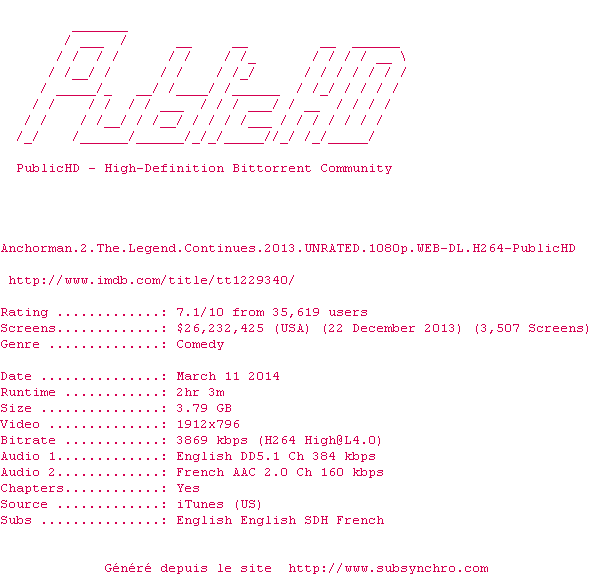 Telechargez le RSS « Fichier de la release Anchorman.2.The.Legend.Continues.2013.UNRATED.1080p.WEB-DL.H264-PublicHD »