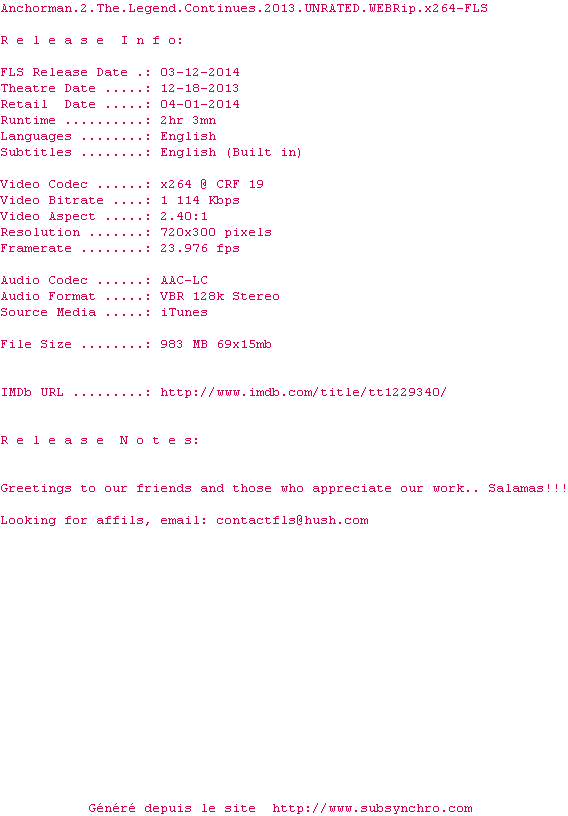 Y avez-vous pense ? Nous proposons déjà 10 sous-titres pour le film Légendes vivantes. Avez-vous essaye de voir si ces sous-titres etaient compatibles avec cette release ? On vous laisse le soin de tester cela pour nous et de contribuer au site en postant le sous-titre en cas de compatiblite constatee !