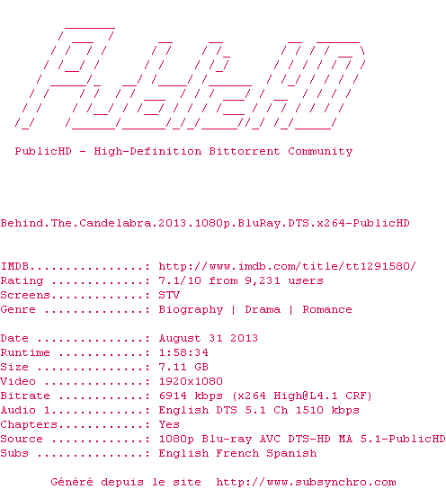 Telechargez le RSS « Fichier de la release Behind.The.Candelabra.2013.1080p.BluRay.DTS.x264-PublicHD »