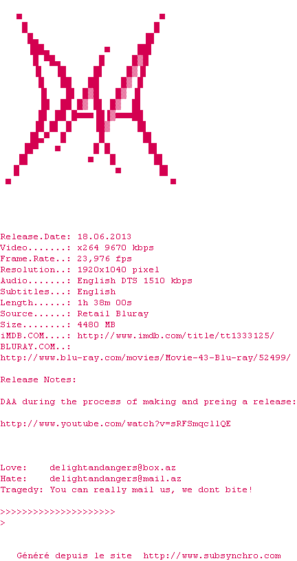 Movie.43.2013.BDRip.x264-DAA.srt Ajouté par Hurukan Ajoute le 09-09-2016 09:31:09 Format : SRT Italique : Oui Taille : 0.00Ko Telechargement : 70 Sous-titre Extrait d'un DVD Z2 Z2 belge Ajouter cette release à ma collection en cas de telechargement des sous-titres 0 0 0 Telecharger le ZiP contenant NFO, Affiche, Sous-titre (*.srt) Commentez le fichier Movie.43.2013.BDRip.x264-DAA.srt Commentez le fichier Movie.43.2013.BDRip.x264-DAA.srt Commentez ce fichier Le fichier 2642-1473406269.srt n'existe pas ! Telechargez le RSS « Fichier de la release Movie.43.2013.1080p.BluRay.x264-DAA » Retour au film « My Movie Project »