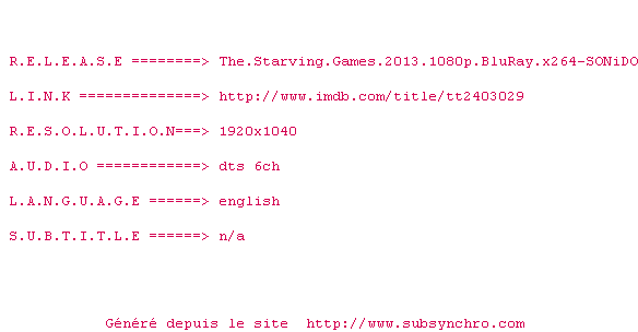tsg_1080_son.srt Ajouté par Hurukan Ajoute le 19-12-2013 16:43:59 Format : SRT Italique : Oui Taille : 0.00Ko Telechargement : 63 Sous-titre Extrait d'un DVD Z1 Ajouter cette release à ma collection en cas de telechargement des sous-titres 0 0 0 Telecharger le ZiP contenant NFO, Affiche, Sous-titre (*.srt) Commentez le fichier tsg_1080_son.srt Commentez le fichier tsg_1080_son.srt Commentez ce fichier Le fichier 2642-1387467839.srt n'existe pas ! Telechargez le RSS « Fichier de la release The.Starving.Games.2013.1080p.BluRay.x264-SONiDO » Retour au film « The Starving Games »