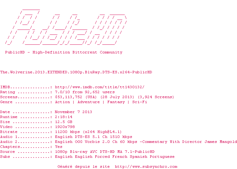 Telechargez le RSS « Fichier de la release The.Wolverine.2013.EXTENDED.1080p.BluRay.DTS-ES.x264-PublicHD »