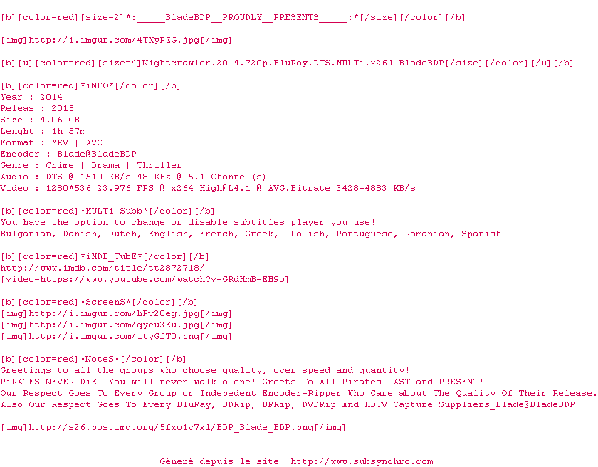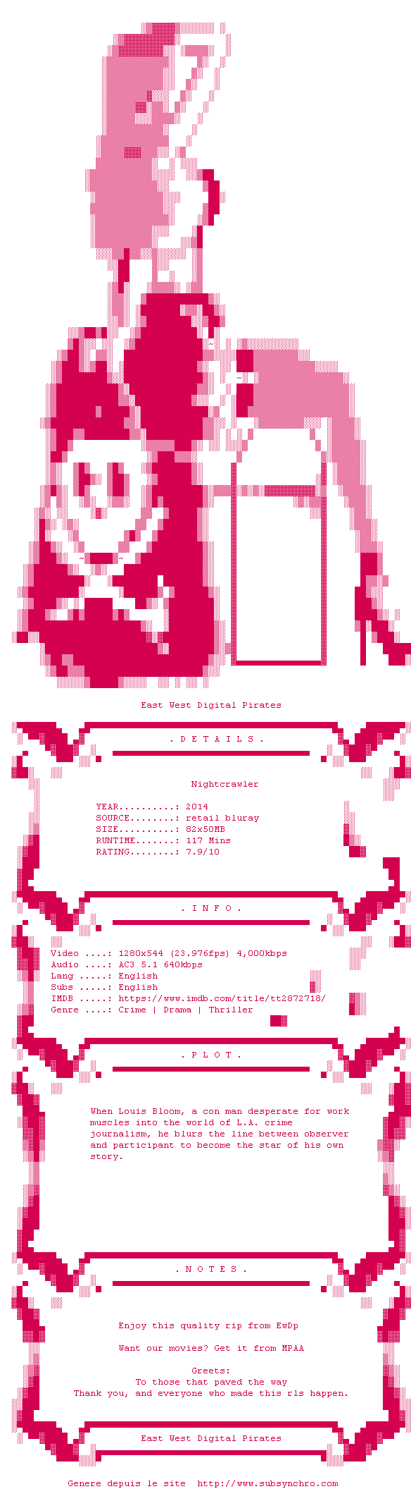 Le commentaire de J-Smoove Commente par J-Smoove (2), Le Jeudi 04 Fevrier 2016 à 23h58 Excellente satire des médias américains. Le film dénonce le voyeurisme dérangeant ,dont fait preuve Louis Bloom (J. Gyllenhaal), la violence des images, qui se banalisent aujourd'hui avec tout ce que nous pouvons voir sur nos écrans. Un thriller plutôt original qui tient en haleine jusqu'à la fin et qui apporte une réflexion sur l'information. Un film que je recommande vivement (en VO de préférence) ! 9 / 10 0 0