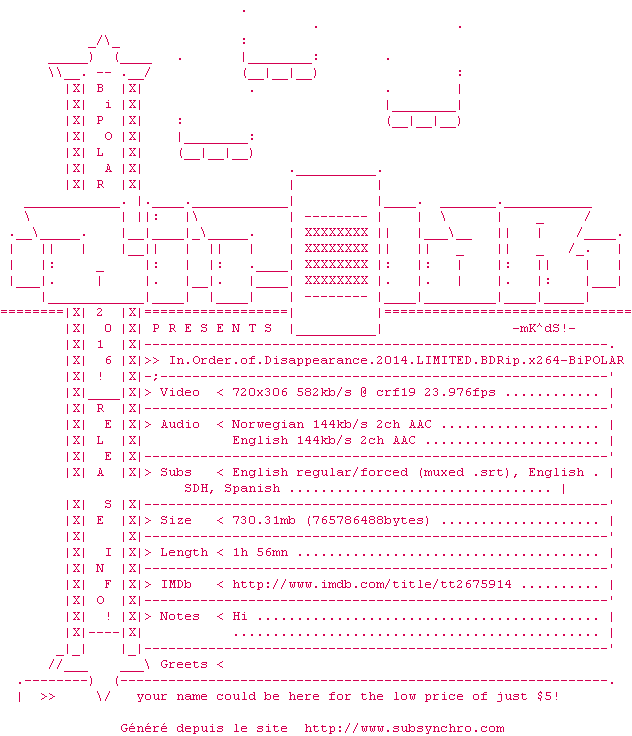 | Voir le nfo de la release In.Order.Of.Disappearance.2014.LIMITED.BDRip.x264-BiPOLAR | BiPOLAR | In.Order.Of.Disappearance.2014.LIMITED.BDRip.x264-BiPOLAR OpenSubtitles | 08/12/2016 | Disponible en Z2 | 1 fichier |