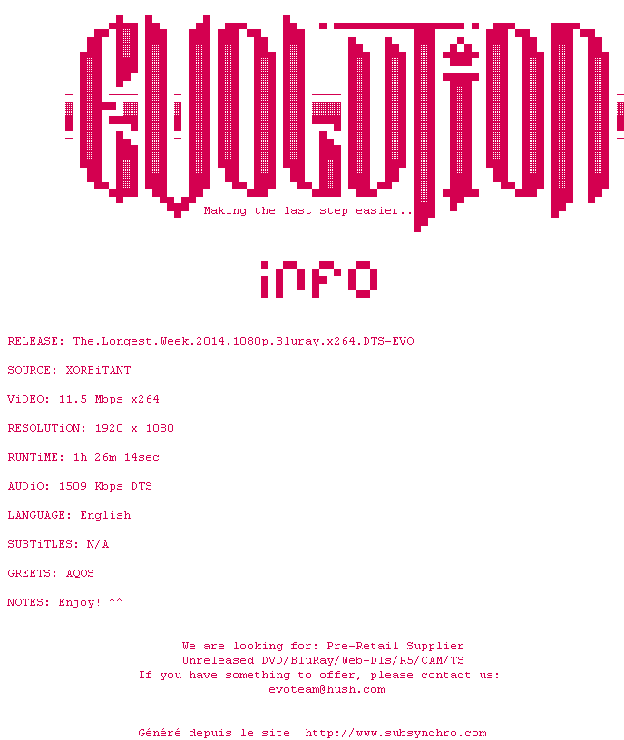 Voir le nfo de la release The.Longest.Week.2014.1080p.Bluray.x264.DTS-EVO