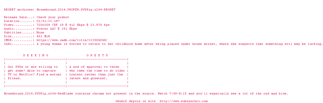 Voir le nfo de la release Housebound.2014.PROPER.DVDRip.x264-REGRET