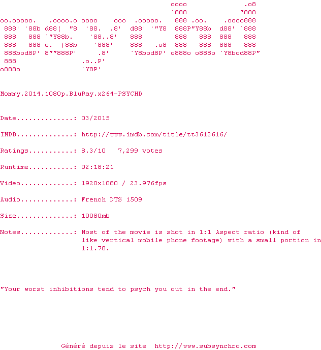 Voir le nfo de la release Mommy.2014.1080p.BluRay.x264-PSYCHD