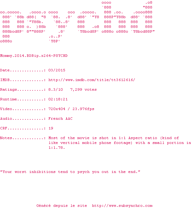 Voir le nfo de la release Mommy.2014.720p.BluRay.x264-PSYCHD