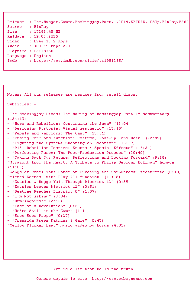 Le commentaire de necro255 Commente par necro255 (25), Le Lundi 23 Fevrier 2015 à 17h11 Très mauvais dans ça conception (ca tourne en rond, avec des lieux qui reviennent plusieurs fois) et dans son approche (scinder en 2, alors qu'un suffisait largement. Le summun de la nullité. On as même droit à un passage qui imite la comédie musicale. 1.5 / 10 4 0