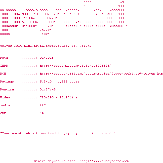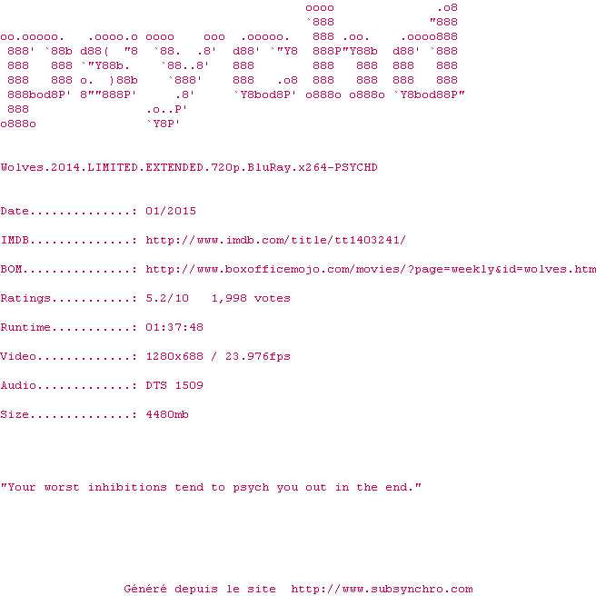 Voir le nfo de la release Wolves.2014.LIMITED.EXTENDED.720p.BluRay.x264-PSYCHD