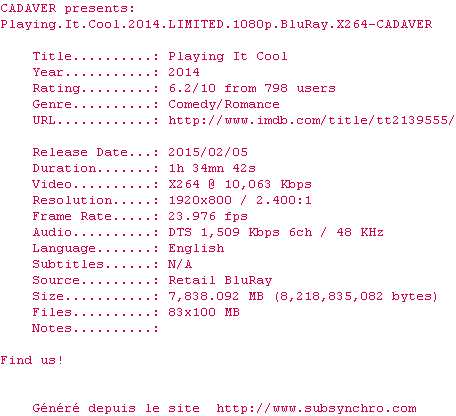 Voir le nfo de la release Playing.It.Cool.2014.LIMITED.1080p.BluRay.X264-CADAVER