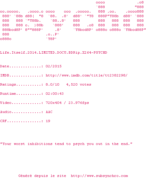 Voir le nfo de la release Life.Itself.2014.LIMITED.DOCU.BDRip.X264-PSYCHD