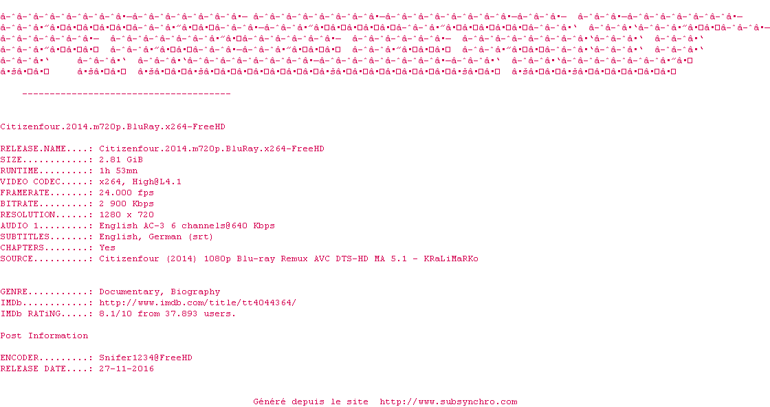 Voir le nfo de la release Citizenfour.2014.m720p.BluRay.x264-FreeHD
