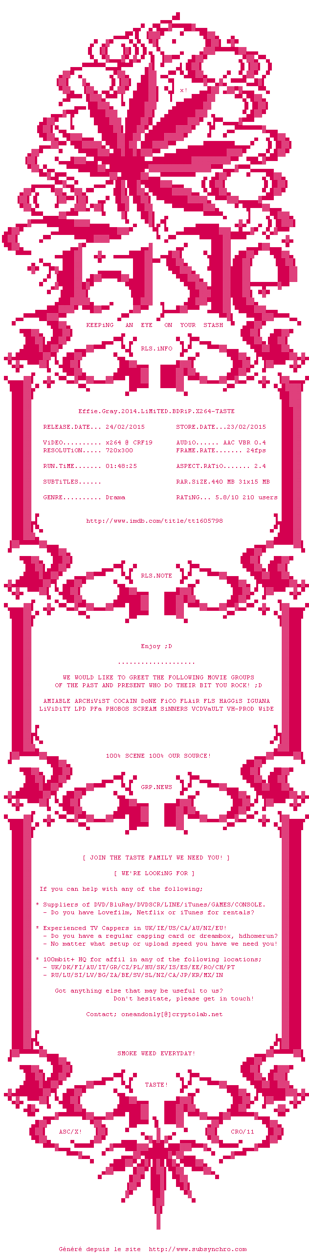 Voir le nfo de la release Effie.Gray.2014.LiMiTED.BDRiP.X264-TASTE