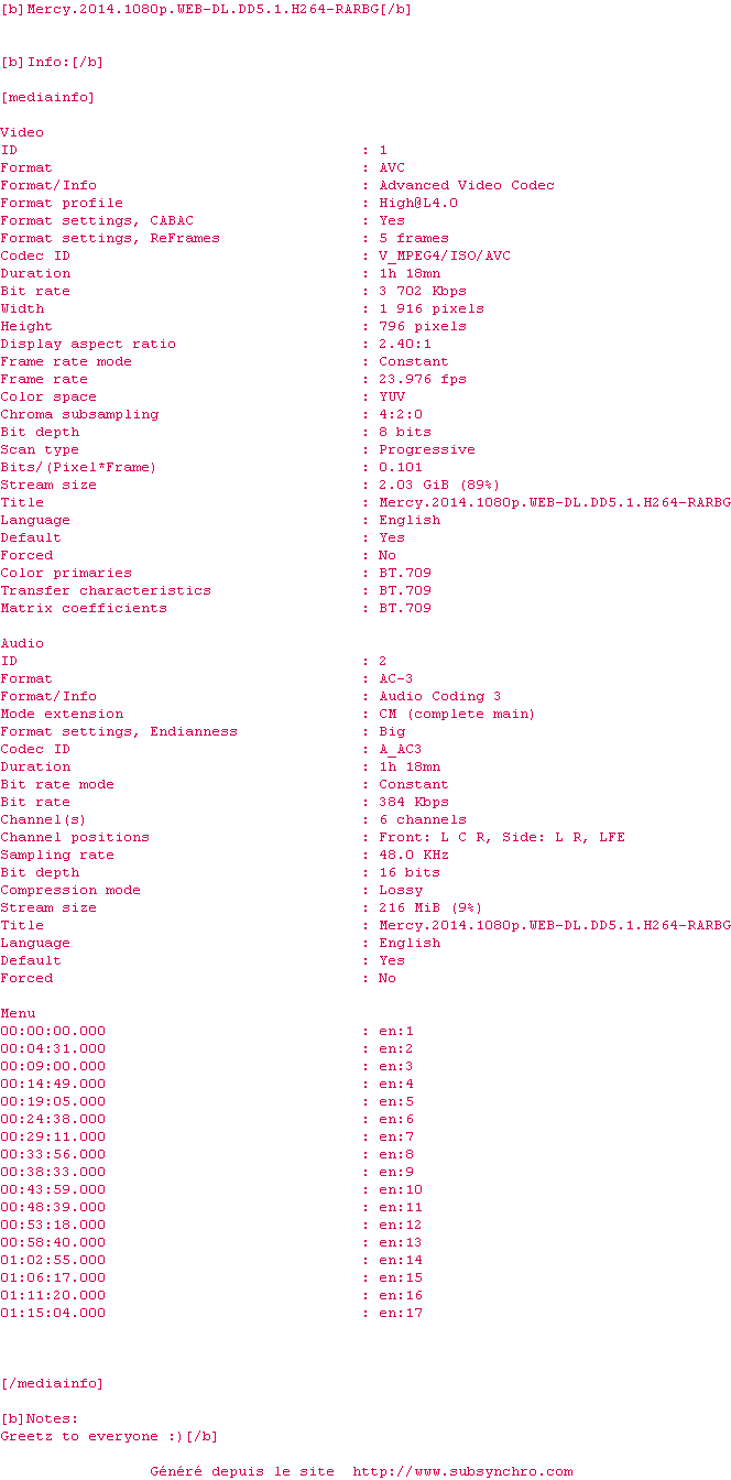 Voir le nfo de la release Mercy.2014.1080p.WEB-DL.DD5.1.H264-RARBG