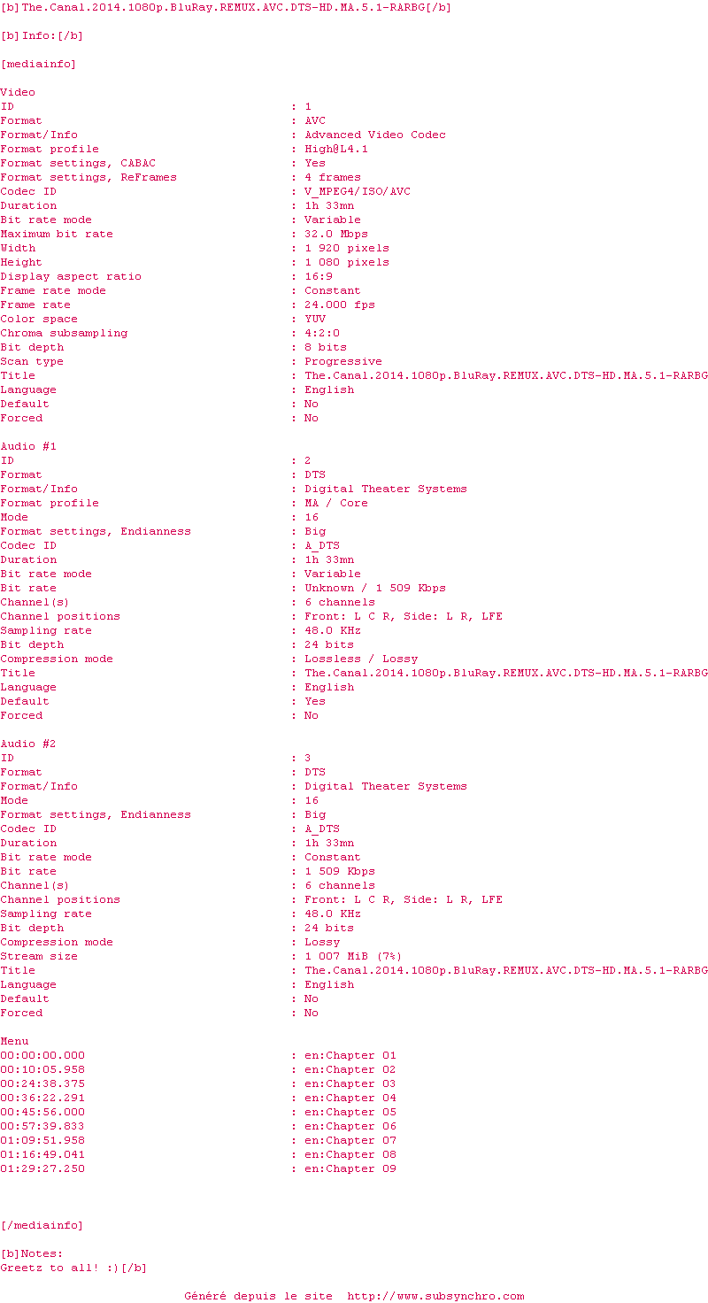 Voir le nfo de la release The.Canal.2014.1080p.BluRay.REMUX.AVC.DTS-HD.MA.5.1-RARBG