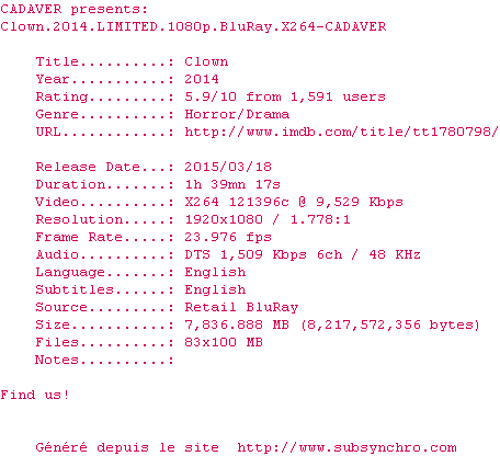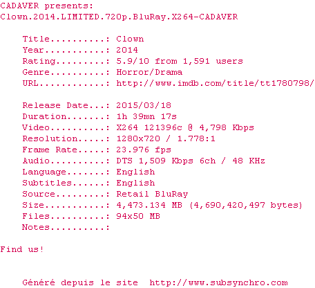 Lorsque le clown engagé pour animer l'anniversaire de son fils leur fait faux bond, un père de famille doit prendre la relève et lui-même revêtir un déguisement de clown pour assurer le spectacle. Mais très vite, il réalise que le costume est devenu une seconde peau dont il ne pourra se débarasser. A moins d'accomplir une mission macabre...