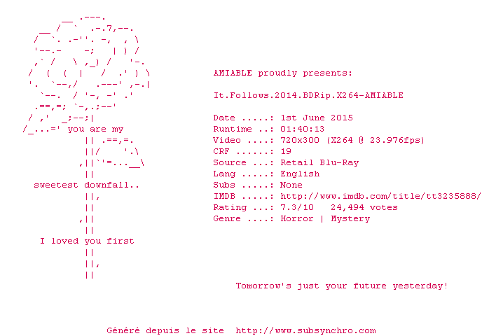 Le commentaire de toki Commente par toki (13), Le Vendredi 30 Octobre 2015 à 21h01 Ce film est bourré de défauts, mais le pitch est génial. Une fois qu'on a vu "It Follows", on a du mal à l'oublier. A voir absolument, même si c'est loin d'être un chef d'oeuvre. 0 0