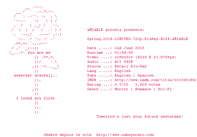 Voir le nfo de la release Spring.2014.LIMITED.BDRip.X264-AMIABLE