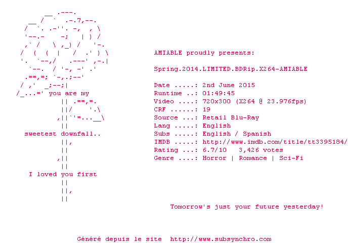 Voir le nfo de la release Spring.2014.LIMITED.1080p.BluRay.X264-AMIABLE