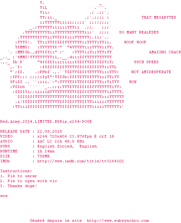 Voir le nfo de la release Red.Army.2014.LIMITED.720p.BluRay.x264-DOGE