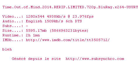 Voir le nfo de la release Time.Out.Of.Mind.2014.RERIP.LIMITED.720p.BluRay.x264-USURY
