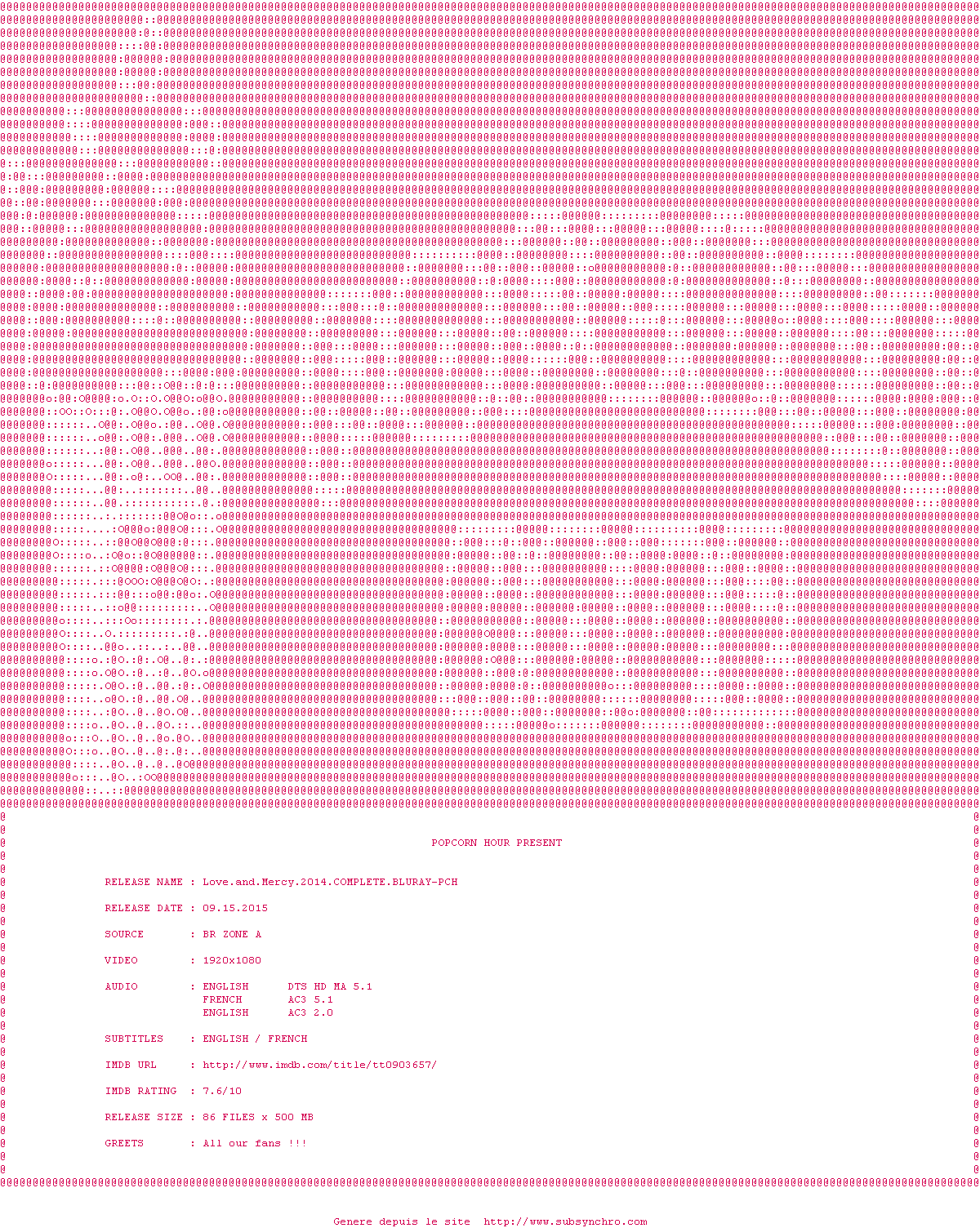 Y avez-vous pense ? Nous proposons déjà 1534 sous-titres pour le film Love & Mercy, la véritable histoire de Brian Wilson des Beach Boys. Avez-vous essaye de voir si ces sous-titres etaient compatibles avec cette release ? On vous laisse le soin de tester cela pour nous et de contribuer au site en postant le sous-titre en cas de compatiblite constatee !
