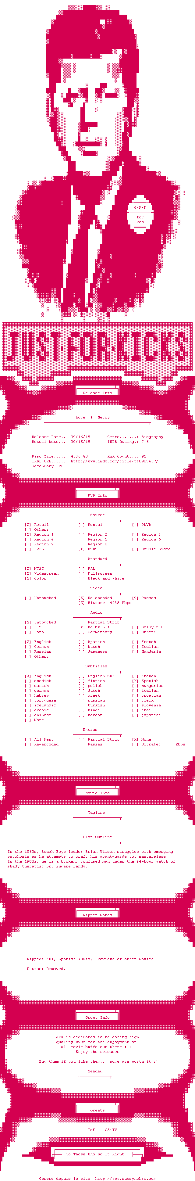 Y avez-vous pense ? Nous proposons déjà 1534 sous-titres pour le film Love & Mercy, la véritable histoire de Brian Wilson des Beach Boys. Avez-vous essaye de voir si ces sous-titres etaient compatibles avec cette release ? On vous laisse le soin de tester cela pour nous et de contribuer au site en postant le sous-titre en cas de compatiblite constatee !