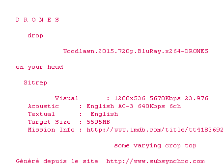 | Voir le nfo de la release Woodlawn.2015.720p.BluRay.x264-DRONES | DRONES | Woodlawn.2015.720p.BluRay.x264-DRONES OpenSubtitles | 0 fichier | ||