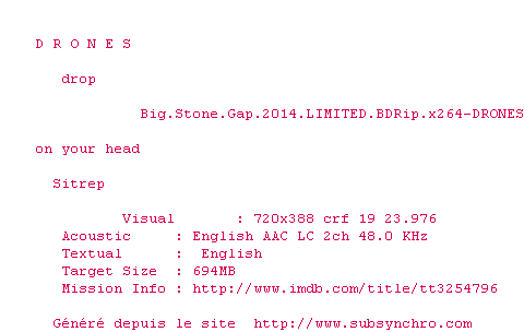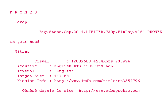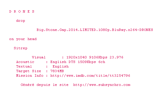 Voir le nfo de la release Big.Stone.Gap.2014.LIMITED.1080p.BluRay.x264-DRONES