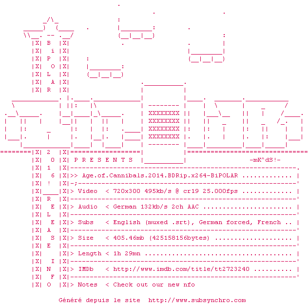 Voir le nfo de la release Age.Of.Cannibals.2014.BDRip.x264-BiPOLAR
