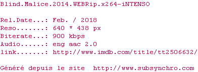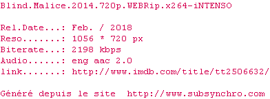 | Voir le nfo de la release Blind.Malice.2014.WEBRip.x264-iNTENSO | iNTENSO | Blind.Malice.2014.WEBRip.x264-iNTENSO OpenSubtitles | 0 fichier |