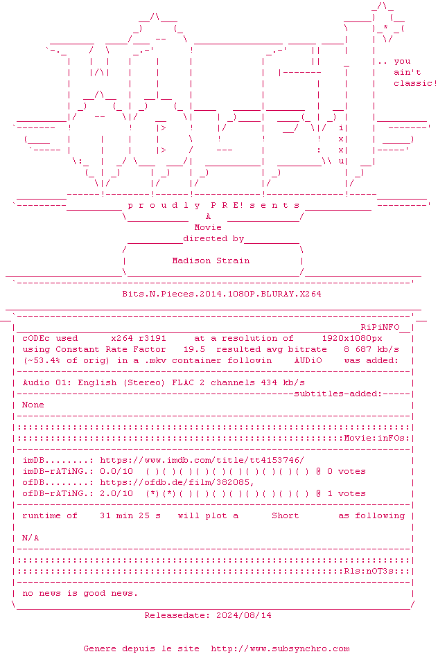 Voir le nfo de la release Bits.N.Pieces.2014.BDRIP.x264-WATCHABLE