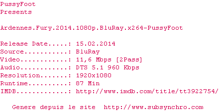 Y avez-vous pense ? Nous proposons déjà 2084 sous-titres pour le film Ardennes Fury. Avez-vous essaye de voir si ces sous-titres etaient compatibles avec cette release ? On vous laisse le soin de tester cela pour nous et de contribuer au site en postant le sous-titre en cas de compatiblite constatee !