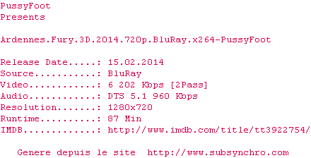 Y avez-vous pense ? Nous proposons déjà 2084 sous-titres pour le film Ardennes Fury. Avez-vous essaye de voir si ces sous-titres etaient compatibles avec cette release ? On vous laisse le soin de tester cela pour nous et de contribuer au site en postant le sous-titre en cas de compatiblite constatee !
