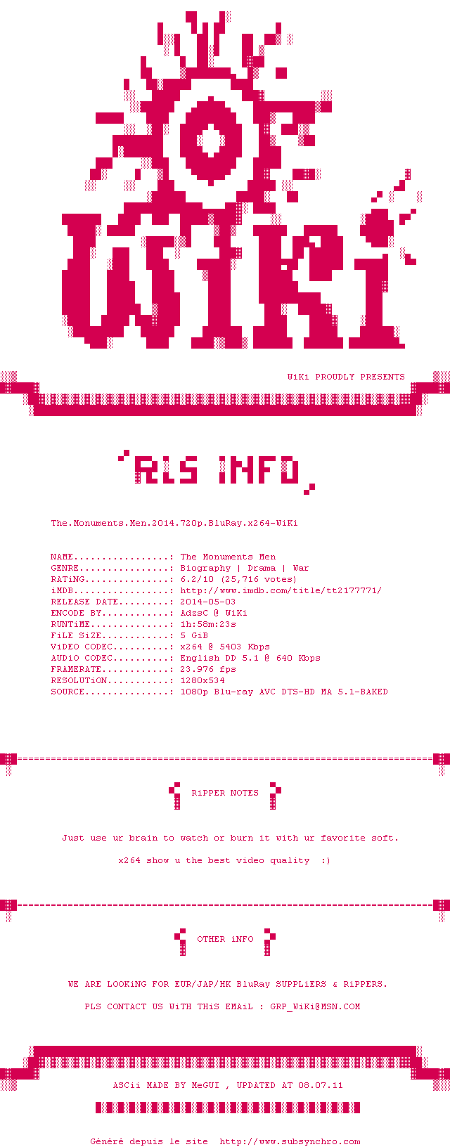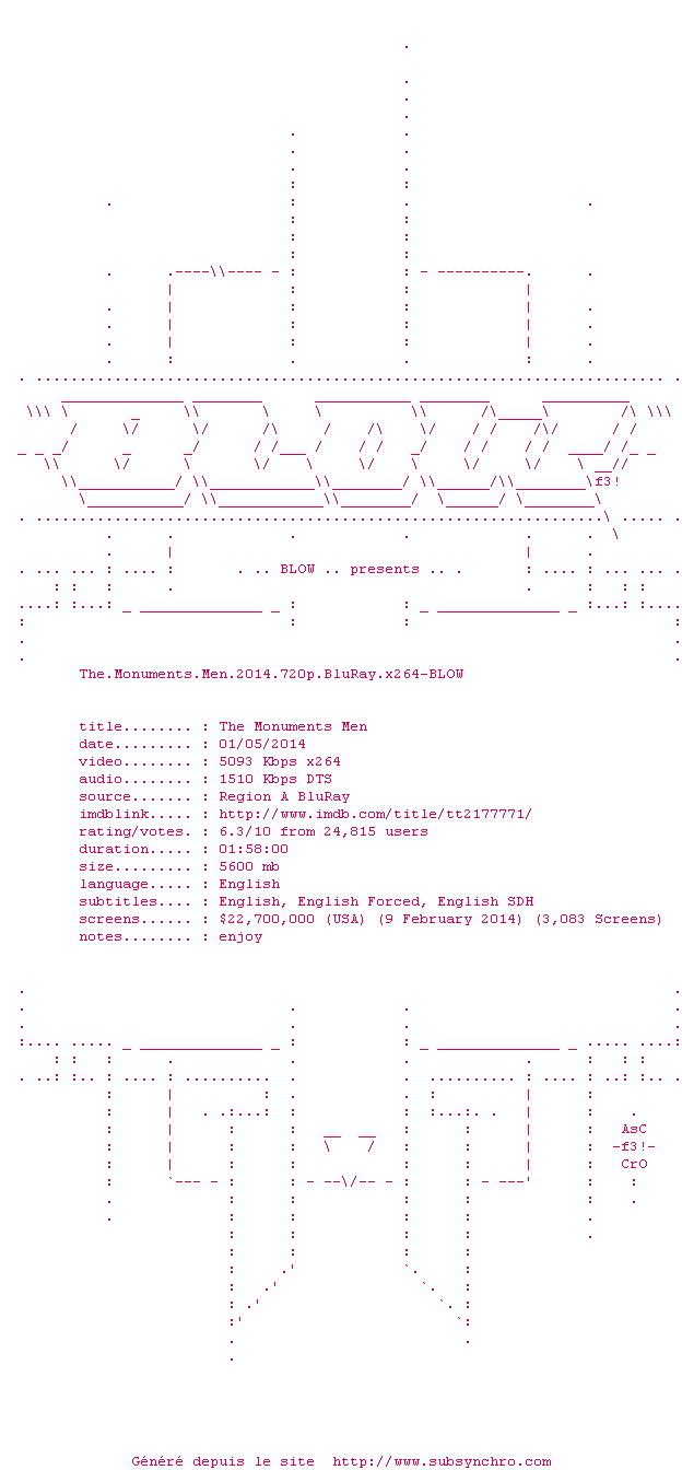 Le commentaire de Plastikman Commente par Plastikman (73), Le Dimanche 04 Mai 2014 à 02h18 Un très bon film de/et avec George Clooney. Tiré d'une histoire vraie, le casting est bien fourni et le scenar bien ficelé. Histoire de vous amuser tout en gardant à l'esprit l'intrigue du film, allez sur internet et dans un moteur de recherche tapez : Cornelius Gurlitt 2014. C'est sérieux ) 7.5 / 10 1 0