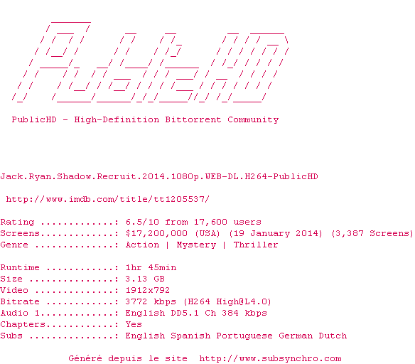Voir le nfo de la release Jack.Ryan.Shadow.Recruit.2014.1080p.WEB-DL.H264-PublicHD PublicHD Jack.Ryan.Shadow.Recruit.2014.1080p.WEB-DL.H264-PublicHD OpenSubtitles 0 fichier