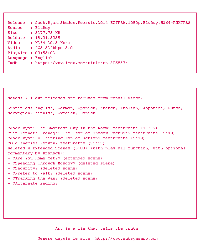 Voir le nfo de la release Jack.Ryan.Shadow.Recruit.2014.EXTRAS.1080p.BluRay.H264-RMXTRAS RMXTRAS Jack.Ryan.Shadow.Recruit.2014.EXTRAS.1080p.BluRay.H264-RMXTRAS OpenSubtitles 0 fichier