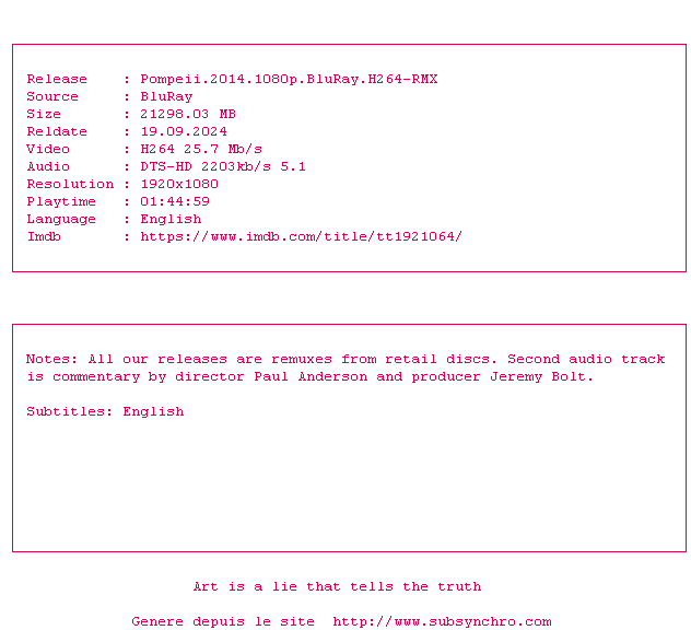 Le commentaire de CyberZip Commente par CyberZip (45), Le Samedi 24 Mai 2014 à 16h14 Un film catastrophe qui se laisse regarder mais sans réelle prétention. L'histoire de base du gladiateur en quête de vengeance est cousue de fil blanc et n'est qu'un prétexte pour meubler les 1H40 du film en attendant l'explosion du volcan. Certes, les 25 dernières minutes sont époustouflantes, y compris les combats dignes de gladiator mais le sujet d'origine était la destruction de Pompéï par le vésuse. On frole le hors sujet et c'est bien dommage. Le personnage de Kiefer Sutherland quant à lui est soporifique, celui de Kit Harington heureusement mèna la danse et permet de suivre le film sans aucun ennui. 5 / 10 0 0