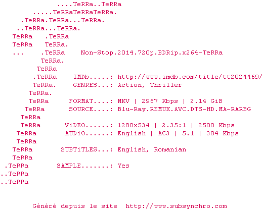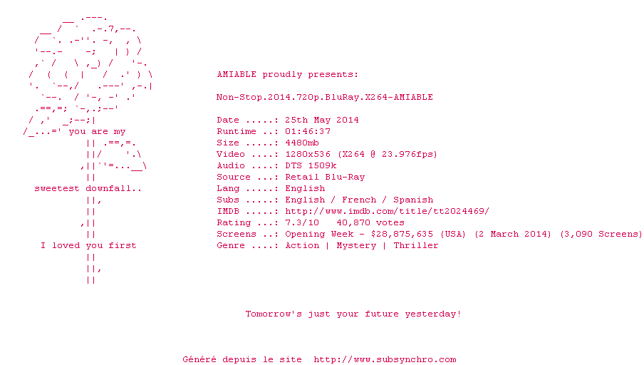 Le commentaire de CyberZip Commente par CyberZip (46), Le Vendredi 11 Juillet 2014 à 13h37 bon film de suspens qui nous tient en haleine jusqu'au bout malgré un scénario des + simple. La fin de ce genre de film est connue d'avance et ne laisse place à aucun rebondissement. On peut regretter l'inutilité du personnage de Julianne Moore. 6 / 10 0 0