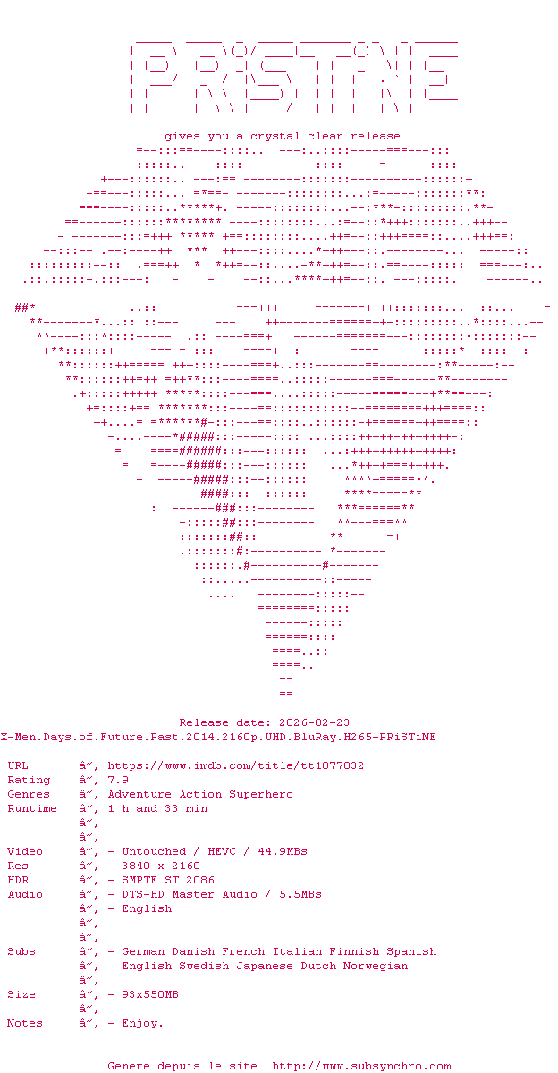 La release X-Men.Days.Of.Future.Past.2014.2160p.UHD.BluRay.H265-PRiSTiNE est en 4K