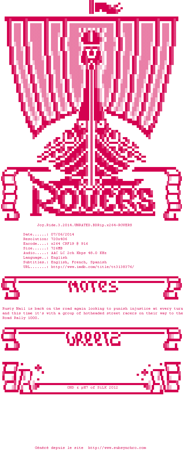 Voir le nfo de la release Joy.Ride.3.2014.UNRATED.1080p.BluRay.x264-ROVERS