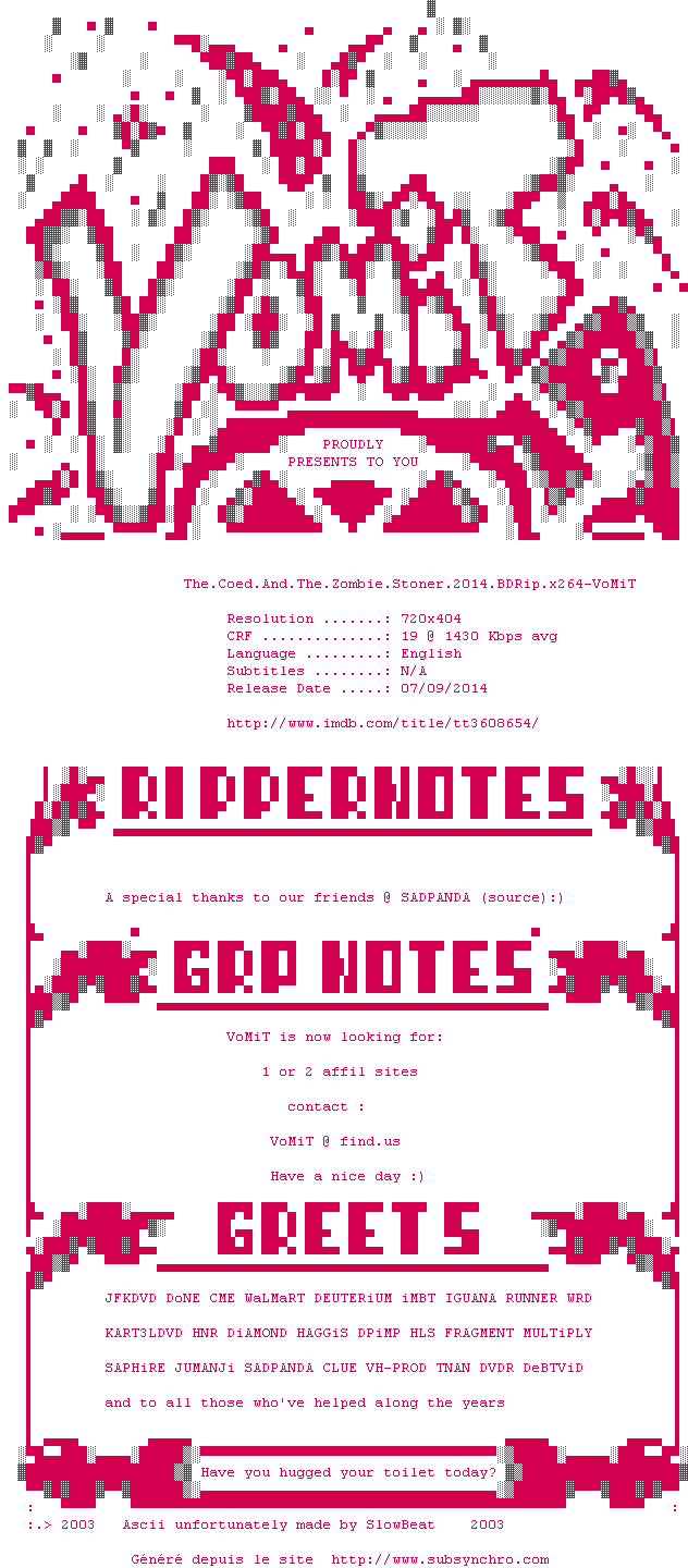 Voir le nfo de la release The.Coed.And.The.Zombie.Stoner.2014.BDRip.x264-VoMiT