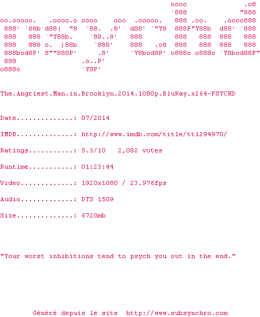 Voir le nfo de la release The.Angriest.Man.in.Brooklyn.2014.BDRip.x264-PSYCHD