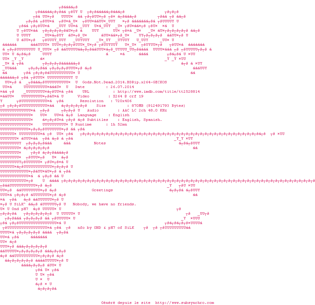 Voir le nfo de la release Gods.Not.Dead.2014.720p.BluRay.x264-GECKOS